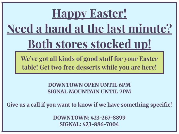 Rick and Nancy Adams started serving Blue Plates in a small restaurant on Chattanooga's southside over twenty years ago. A lot has changed since then, but some things always stay the same; same recipes, same ingredients, and same goal- great southern cooking. Stop by during lunch for a classic southern blue plate or enjoy our cooking from your own home by choosing from our wide selection of grab and go entrees, sides, salads, and quiche.